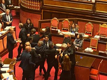 Ad accendere gli animi, in Senato, sarebbe stato l’intervento del pentastellato Ettore Licheri, che dai banchi ha più volte fatto riferimento alla premier Giorgia Meloni, dicendo ‘voi siete Giorgia’. Poi al centro dell’Aula si vedono, come testimoniano alcuni video, il senatore Roberto Menia (Fdi) che pare cercare il confronto fisico con il pentastellato Marco Croatti. Un parapiglia che vede in campo il questore De Poli a fare da paciere. Con lui altri senatori e i commessi d’Aula, mentre anche altri non nascondono il nervosismo, tra insulti e accuse.